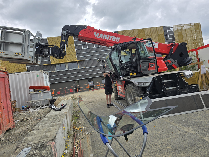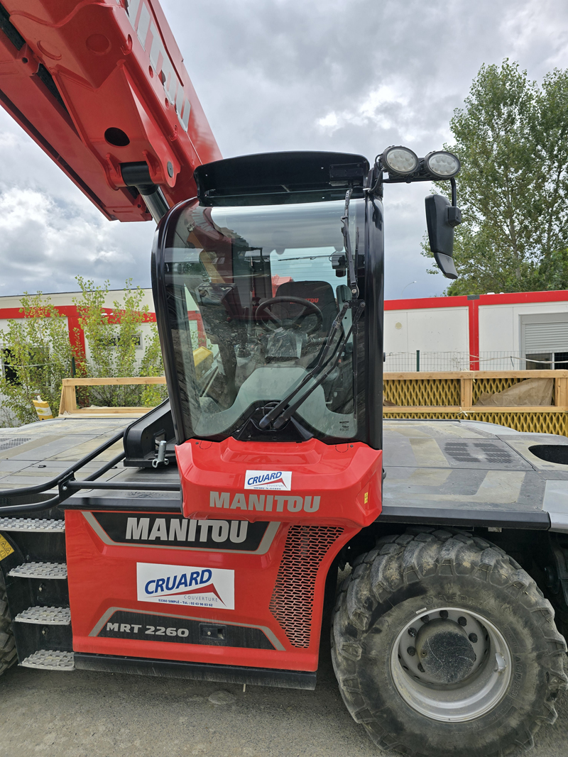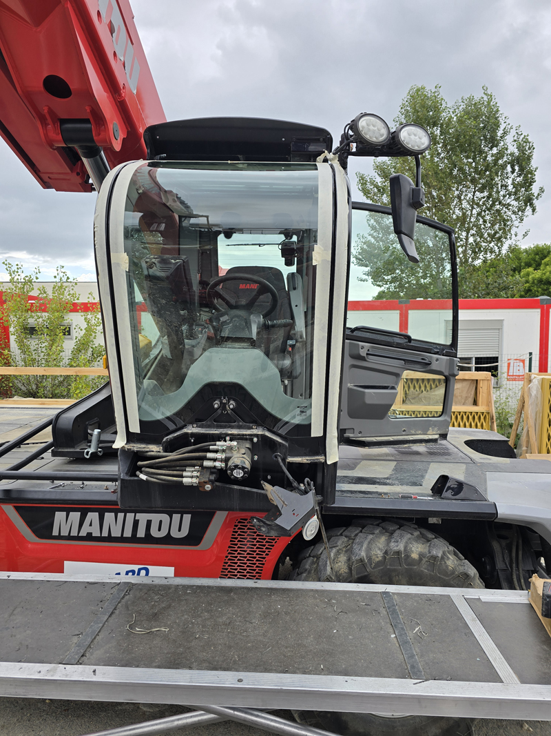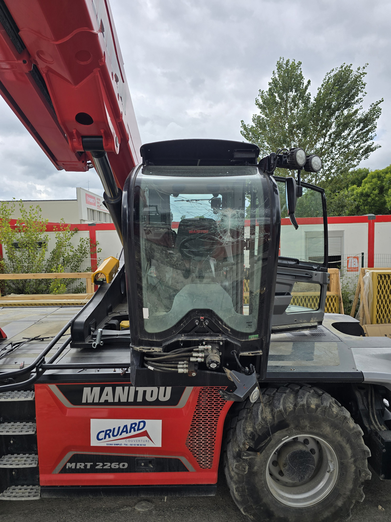 Un Manitou MRT 2260, c’est un engin de manutention équipé d’un bras télescopique et d’une nacelle. Costaud, imposant, et doté d’une cabine dont le pare-brise arrondi ne se remplace pas à la légère.