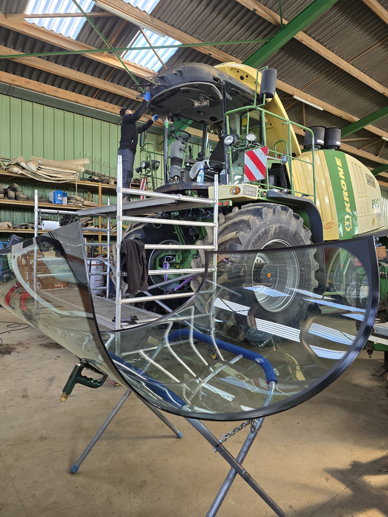 Ce qui rend ce type d’intervention particulier, c’est la forme du vitrage. La cabine panoramique d’une ensileuse est dotée d’un pare-brise très arrondi, loin des formes standard. Poser ce type de pièce demande une vraie maîtrise technique et une expérience solide du monde agricole. Pas question d’improviser.