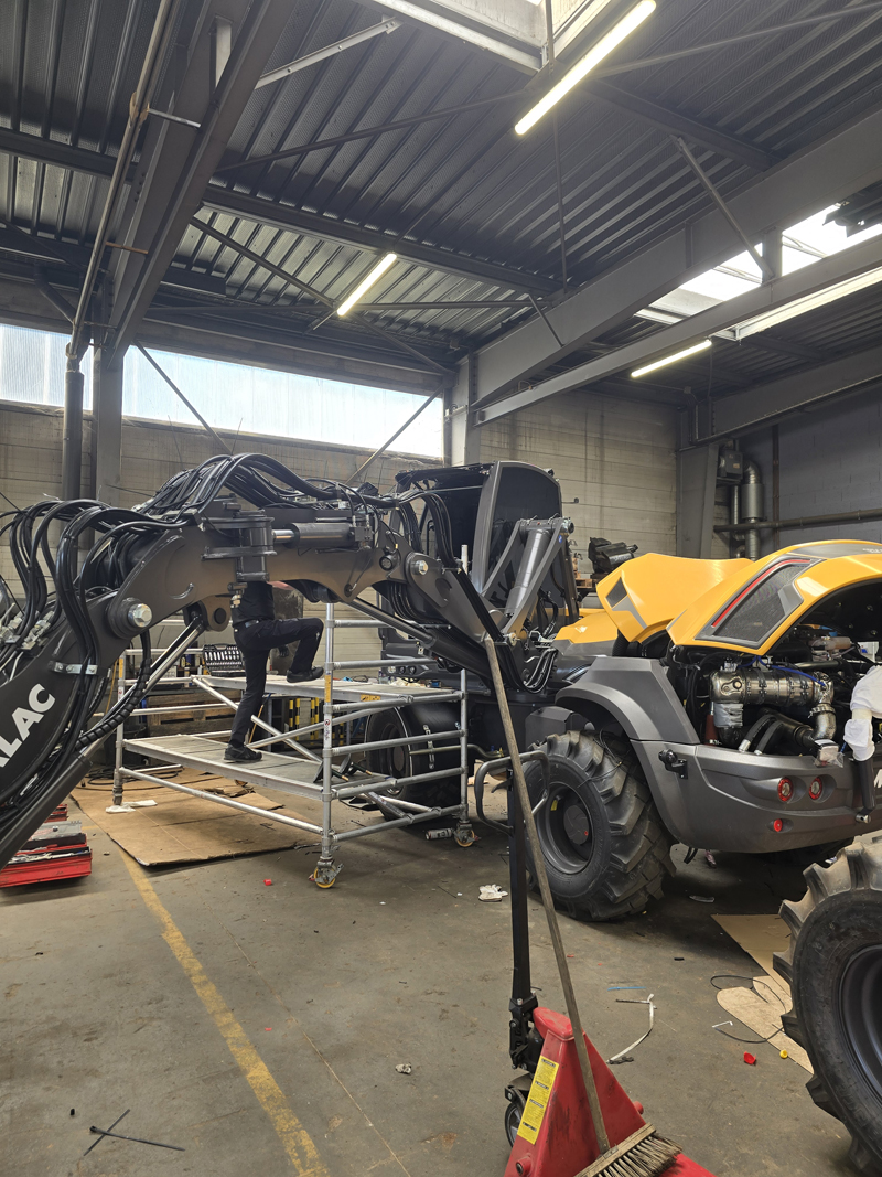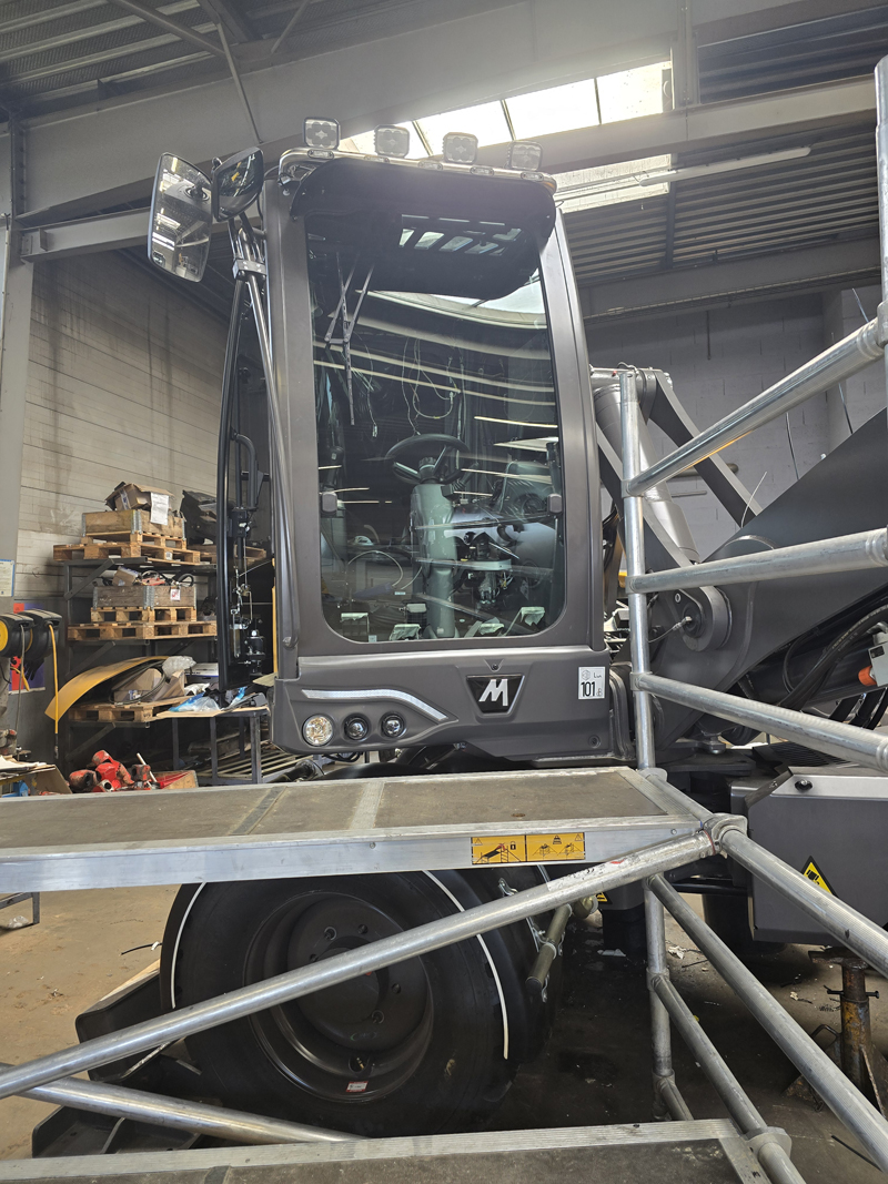 Une pelle Mecalac 12MRX, machine neuve en concession à Niort. Pourtant, dès la sortie d’usine, le pare-brise d’origine posait problème : conçu en deux parties, la séparation horizontale tombait en plein milieu du champ de vision de l’opérateur. Une gêne réelle au quotidien.